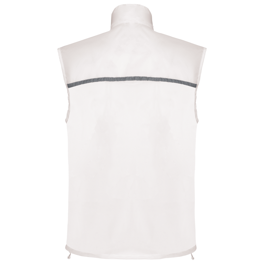 Winddicht aus 100% Polyamid. Rückenteil aus Netzstoff. Elastischer Kordelzug mit Stoppern am Bund. Reflektorstreifen vorne und hinten. Mehrzweck-Innentasche. Abmessung 9,5x11 cm.
